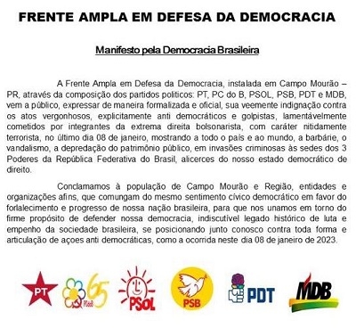 Seis partidos políticos de Campo Mourão divulgaram um Manifesto pela Democracia Brasileira. A entitulada Frente Ampla em Defesa da Democracia chama de "vergonhosos, explicitamente antidemocráticos e golpistas" os atos do último domingo, em Brasília. O texto conclama à população, entidades e organizações de Campo Mourão e região para que se unam no propósito de defender a democracia.