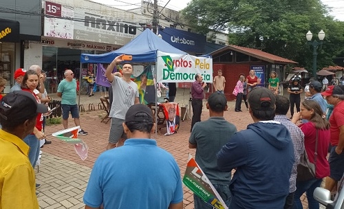 Um grupo de pessoas ligadas a partidos políticos de esquerda, sindicatos e movimentos sociais participou neste sábado, no calçadão de Campo Mourão, de um ato em defesa da democracia. Nos discursos, críticas às invasões e depredações que ocorreram domingo passado nos três poderes da República, em Brasília. Claro que não iriam faltar falas de apoio ao presidente Lula e críticas ao ex-presidente Jair Bolsonaro.