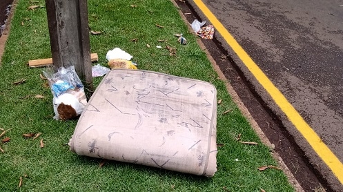 Colchão jogado em canteiro central da av Goioerê, centro de Campo Mourão.