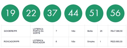 Ninguém acertou as seis dezenas da Mega Sena sorteadas neste sábado. O prêmio estava acumulado em R$ 134 milhões e deve chegar a R$ 160 milhões no próximo concurso. A quina teve 393 apostas ganhadoras. Duas foram feitas na região. Uma é um bolão de Goioerê (lotérica Porta da Sorte) e vai levar R$ 47,3 mil. A outra, de Roncador (lotérica Roncador), levará R$ 23,6 mil. Ah, por um numerozinho...