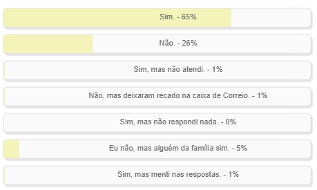 Enquete com esta pergunta teve votação encerrada neste domingo. Resultado? 26% dos que responderam disseram que não foram visitados, não. Teve 1% que respondeu que recebeu a visita, mas não atendeu o recenseador. A maioria - 65% - confirmou a visita, além de 5% que foi na opção que alguém da família atendeu ao recenseador. O resultado completo está no quadro acima.