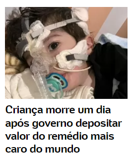 Foi destaque no portal UOL, nesta quinta-feira, o caso do menino Vinícius de Brito Samsel, de Engenheiro Beltrão, que morreu esta semana, aos 3 anos, em decorrência Atrofia Muscular Espinhal. Ele precisava de Zolsgensma, um dos remédios mais caros do mundo - cerca de R$ 7,4 milhões. A família conseguiu liminar do STF, em dezembro, para que o governo federal desse o medicamento, mas o dinheiro só foi liberado na última terça-feira, um dia antes de Vinícius morrer.