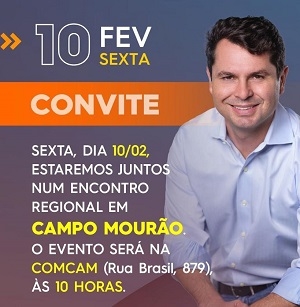 O deputado estadual Alexandre Curi estará em Campo Mourão nesta sexta-feira (10h). Vai participar de encontro regional na sede da Comcam. Ele foi o candidato à Assembleia Legislativa mais votado nas eleições do ano passado. Somou 237.033 votos e foi eleito pela sexta vez.