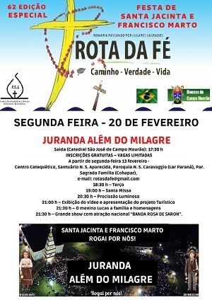 A Rota da Fé fará no próximo dia 20 uma edição especial para comemorar o dia dos Santos Pastorinhos - Santa Jacinta e São Francisco Marto. Irá de Campo Mourão a Juranda, onde uma programação especial será realizada, incluindo a presença do menino Lucas, que recebeu o milagre. A saída será às 17h30, na Catedral São José, com retorno previsto para às 22h. A inscrição é gratuita, mas são poucas vagas.