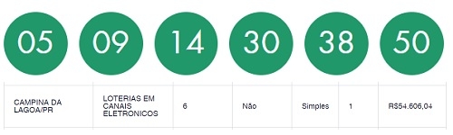 Uma aposta de Campina da Lagoa fez a quina na Mega Sena sorteada neste sábado. Faturou o prêmio de R$ 54,6 mil. A aposta foi feita em canais eletrônicos. Foram 49 quinas em todo o País, quatro no Paraná. As seis dezenas ninguém acertou e o prêmio de R$ 4 milhões ficou acumulado para o próximo sorteio, que deve chegar a R$ 10 milhões.