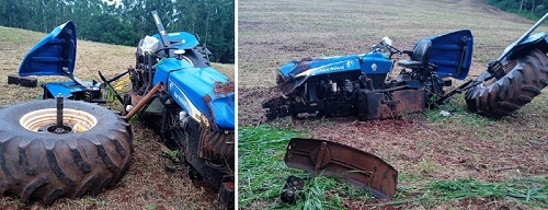 As fotos estão no site Central R3 e mostram o estado que ficou o trator de uma propriedade rural de Nova Cantu. O maquinário teria sido deixado desengatado e acabou descendo sozinho, até capotar várias vezes. Quando parou, ficou assim, desmontado. NInguém se feriu.
