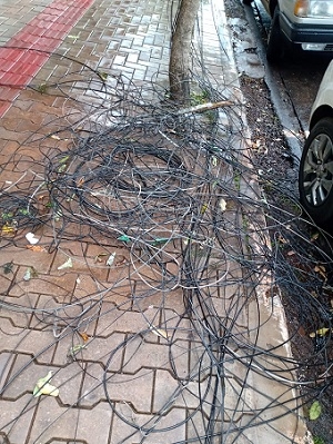 Faz mais de uma semana que essa maçaroca de fios está em calçada da rua Harrison José Borges, no centro de Campo Mourão. Quem vai tirar?