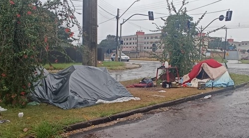 Operação que envolveu prefeitura e Polícia Militar desmontou barracas que estavam há vários dias em canteiro central perto do mercado Condor, em Campo Mourão. Seis pessoas estavam morando no local. Três foram para a Casa de Passagem, duas para casas de familiares e uma saiu sem dizer para onde ia.