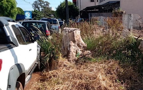 Mato ocupada toda a calçada em trecho da rua Santos Dummont, no centro de Campo Mourão.