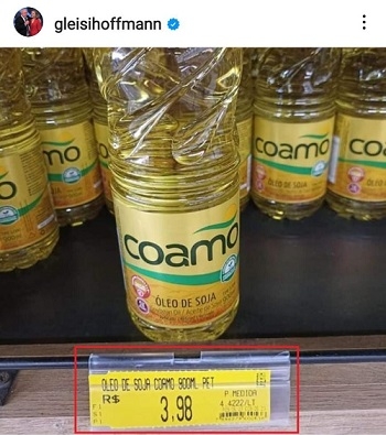 Gleisi Hoffmann, deputada federal e presidente nacional do PT, ao repostar em redes sociais foto que mostra o óleo de soja Coamo sendo vendido a R$ 3,98. A postagem original foi feita por Irineu Ricardo, de Campo Mourão, que tirou a foto no sábado, em supermercado da cidade.