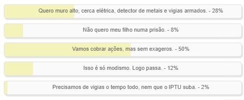 "Qual a sua opinião sobre a segurança nas escolas?" Enquete com esta pergunta foi encerrada neste domingo. "Vamos cobrar ações, mas sem exageros" venceu com 50% dos votos. "Quero muro alto, cerca elétrica, detector de metais e vigias armados" ficou em segundo, com 28%. Já para 12% "Isso é só modismo. Logo passa". O resultado completo está no quadro acima.