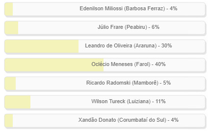 "Dos municípios vizinhos, qual prefeito poderia ser candidato em Campo Mourão em 2024?" Enquete com esta pergunta foi encerrada neste domingo. Oclécio Meneses, de Farol, teve 40% dos votos e venceu de virada. Leandro de Oliveira, de Araruna, liderou boa parte da semana, mas no fim ficou em segundo, com 30%. Wilson Tureck, de Luiziana, completou o pódio, com 11%. O resultado completo está no quadro acima.
