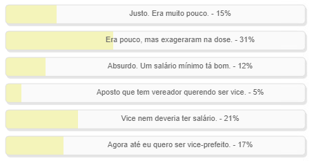 "O que você achou do salário do vice-prefeito de Campo Mourão subir, a partir de 2025, de R$ 1,3 mil para R$ 12,5 mil?" Enquete com esta pergunta foi encerrada neste domingo. Venceu a alternativa "Era pouco, mas exageraram na dose", com 31% dos votos. "Vice nem deveria ter salário" ficou em segundo, com 21%. E completou o pódio "Agora até eu quero ser vice-prefeito", com 17%. O resultado completo está no quadro acima.