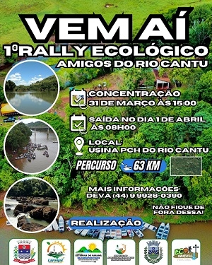 A prefeituras de Altamira do Paraná, Campina da Lagoa, Nova Cantu e Laranjal vão realizar no próximo dia 1°, o Rally Ecológico Amigos do Rio Cantu. A concentração começa na véspera, às 15h, na PCH do rio Cantu, com a largada às 8h do dia seguinte. O rally vai terminar na altura da ponte do rio, em Altamira do Paraná. O percurso total terá cerca de 63 km.