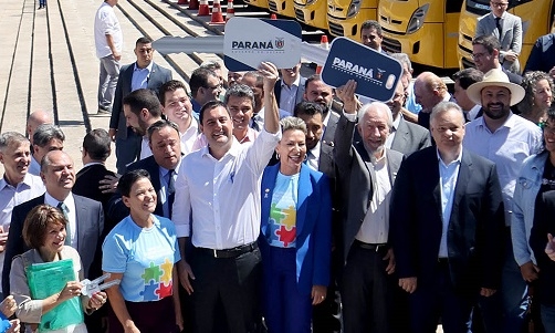 O governo do Estado repassou nesta segunda-feira 173 ônibus escolares para 139 municiípios. Deste total, 16 foram para 10 prefeituras da região, sendo que Ubiratã recebeu mais: três. Olha aí o prefeito Fábio D"Alécio ao lado do governador Ratinho Jr! O investimento total foi de R$ 58,5 milhões, incluindo recursos do Estado e de emendas parlamentares junto ao FNDE.