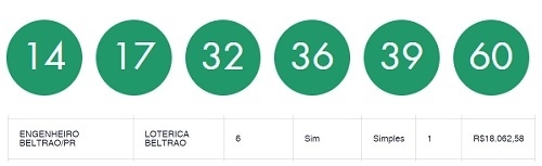 Uma aposta feita em São Paulo foi a única que acertou as seis dezenas sorteadas neste sábado na Mega Sena. Resultado? Faturou prêmio de R$ 46,5 milhões. Já a quina teve 239 apostas ganhadores e cada uma vai levar R$ 18 mil. Uma delas foi feita na lotérica Beltrão, em Engenheiro Beltrão. Ou seja: tem mais um "quase" milionário na região...