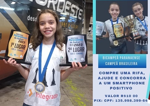 A estudante Natália Biazon, de Campo Mourão, conquistou este ano o bicampeonato paranaense de xadrez (sub-12 feminino). Com isso, poderá buscar bi-brasileiro no Festival Nacional que será realizado de 3 a 9 de maio, em Natal/RN. Os custos da viagem, entre passagens, estadia e inscrição, ficarão em torno de R$ 9 mil. Para ajudar nas despesas está sendo feita rifa de um smartphone (veja na ilustração), além da busca por patrocinadores.