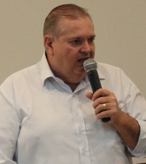 Xandão Donato, prefeito de Corumbataí do Sul e presidente da Comcam, ao contar que é técnico em contabilidade e técnico em enfermagem, mas não fez curso superior; durante reunião da Comcam, nesta sexta-feira.
