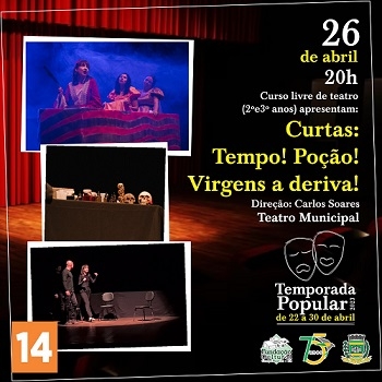 Segue no Teatro Municipal de Campo Mourão a programação da Temporada Popular. Nesta quarta-feira serão três peças num espetáculo só: "Tempo!", "Poção!" e "Virgens a Deriva". No palco, alunos do curso livre de teatro. Na quinta-feira tem stand-up com Josmar Antunes. De sexta a domingo serão mais três espetáculos teatrais, sempre às 20h e sempre com entrada franca.