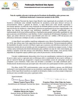 A Federação Nacional das Apaes divulgou nota de repúdio contra uma fala do presidente Lula.