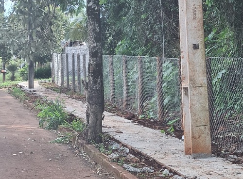 Final da rua Santa Cruz, perto do bosque. Os postes ficaram no meio da passagem de pedestre. E ainda tem fio solto no caminho...
