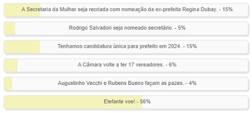 "Na política mourãoense não duvido mais nem que..." Enquete encerrada neste domingo deu vitória à alternativa "Elefante voe", comm 56% dos votos. Ou seja: disparado. Duas alternativas tiveram 15% e empataram na segunda colocação - "A Secretaria da Mulher seja recriada com nomeação da ex-prefeita Regina Dubay" e "Tenhamos candidatura única para prefeito em 2024". O resultado completo está no quadro acima.