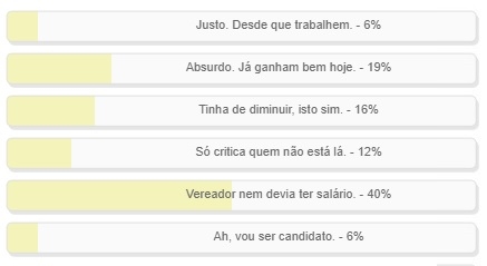 "O que achou do salário de R$ 12.500 para os vereadores que se elegerem em 2024 em Campo Mourão?" Enquete teve votação encerrada neste domingo. Venceu, com 40% dos votos, a alternativa "Vereador nem devia ter salário". Em segundo, com 19%, ficou "Absurdo. Já ganham bem hoje". Outros 16% votaram em "Tinha de diminuir, isto sim". O resultado completo está no quadro acima.