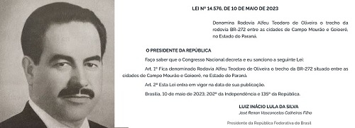 Foi publicada nesta quinta-feira a lei que dá o nome de Alfeu Teodoro de Oliveira à BR-272, entre Campo Mourão e Goioerê.