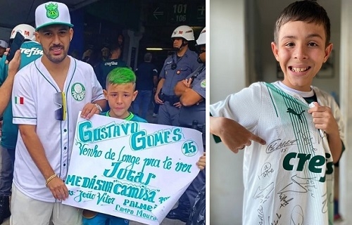 Apelo nas redes - Aí entrou em cena um primo dele, que usou as redes sociais para fazer um apelo ao Palmeiras. Pegou a foto de João Vitor com o cartaz vetado e mandou ver. E não é que deu certo? O menino recebeu uma camisa autografada pelo elenco do Verdão. Detalhe: o primo que fez o apelo é o corintiano Diego Reis.