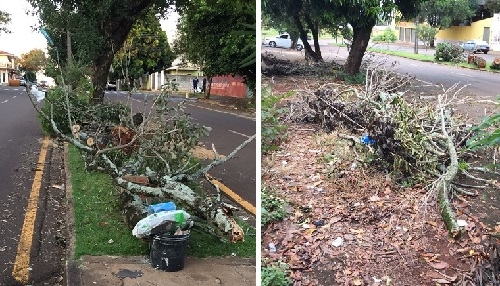 Av. Goioerê, entre a Miguel Luís Pereira e rua Peabiru. A árvore caiu faz uma semana e está desse jeito aí, com um galho ligado a um tronco mais grande e pesado, ocupando uma parte da pista, oferecendo riscos aos motoristas, além de galhos atrapalhando a passagem de pedestres na calçada.