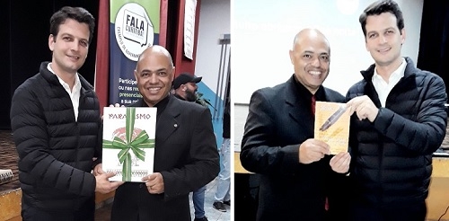 O vice-prefeito de Curitiba e secretário de Estado das Cidades, Eduardo Pimentel, presenteou o advogado e ex-prefeito de Farol, Gilmar Cardoso, com um exemplar do livro "Paranismo". A obra é do professor José Roberto Teixeira Leite e foi lançada como parte das comemorações dos 330 anos de Curitiba. Cardoso retribuiu o presente e repassou a Pimentel o livro "Poesia Nossa de Cada Dia", escrito por ele em parceria com o professor e ex-vereador José Eugênio Maciel, ambos da Academia Mourãoense de Letras.