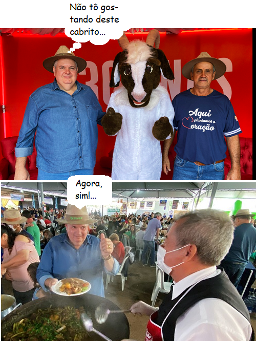 Os cliques são de Corumbataí do Sul, que realizou no domingo a 17ª Festa do Cabrito Apressado. Fez parte das comemorações pelos 36 anos do município. O prefeito Xandão Donato fez pose ao lado da mascote da festa e, claro, não deixou de saborear o prato típico...