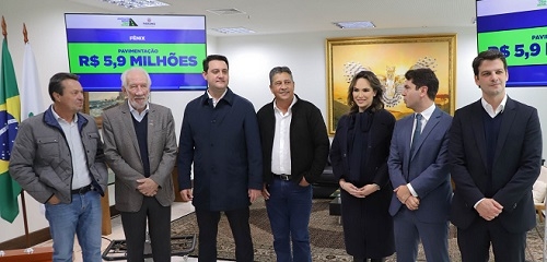 O governador Ratinho Jr assinou nesta segunda-feira cinco contratos do programa Asfalto Novo, Vida Nova. O total é de R$ 26,3 milhões, sendo R$ 5,9 milhões para Fênix. Por isso mesmo, o prefeito Neno Molina estava em Curitiba com o governador. Com o recurso, a cidade chegará a 100% das ruas pavimentadas. O secretário de Estado Márcio Nunes (Turismo) também participou.