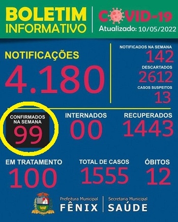 Boletim divulgado nesta terça-feira pela prefeitura de Fênix mostra alta nos casos de covid-10. Foram 99 confirmações na semana, o que levou o município a ter 100 pessoas em tratamento. Todas com sintomas leves, tanto que nenhuma está internada. Na vizinha Quinta do Sol, que chegou a ter mais de 50 casos ativos, houve redução para 14 no boletim desta terça. Os dois municípios têm 5 mil habitantes.