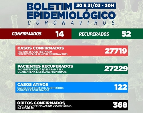 Quatorze casos de covid-19 foram confirmados nesta quarta e quinta-feira em Campo Mourão. Os recuperados nestes dois dias foram 52. Com isso, o número de casos ativos caiu para 122. Março terminou com 983 casos da doença, média de 32,7 por dia. Houve uma morte por covid no mês.