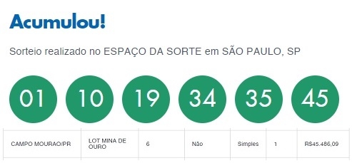 Ninguém acertou as seis dezenas da Mega-Sena sorteadas nesta quarta-feira. Assim, o prêmio de R$ 106 milhões fica acumulado e deve chegar a R$ 120 milhões no próximo sorteio. Detalhe: 168 apostas fizeram a quina e vão levar R$ 45,4 mil cada. Uma delas é de Campo Mourão, feita na lotérica Mina de Ouro. Ou seja: por um numerozinho R$ 106 milhões viraram R$ 45,4 mil...