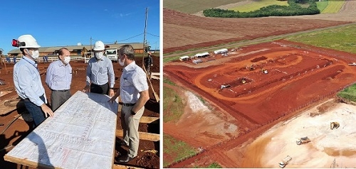 Diretores da Coamo foram visitar as obras da futura fábrica de ração. A construção está na fase de terraplagem. Fica numa área de 10.000 m2 no parque industrial da cooperativa, em Campo Mourão. O prédio terá 35 metros de altura e capacidade para produzir 200 mil toneladas de ração por ano. Hoje a Coamo comercializa 40 mil toneladas produzidas em fábricas de terceiros.