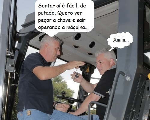 O presidente da Câmara de Campo Mourão, Jadir Pepita, não foi o único a fazer pose na hora da chegada do rolo compactador para a pefeitura, não. O deputado Douglas Fabricio, autor da emenda que viablizou a máquina, também deu uma de operador. O vereador Edilson Martins até ofereceu a chave para ele, mas melhor deixa, né?...