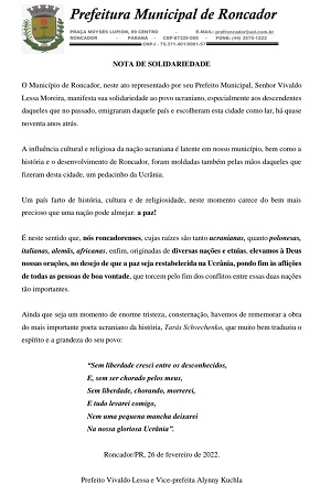 A prefeitura de Roncador divulgou no fim de semana "Nota de Solidariedade" ao povo ucraniano.