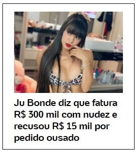 Lembra da Juliana Bonde, a cantora da música da "periquita", que é de Janiópolis? Foi destaque nesta terça-feira no portal UOL. Contou que, com a escassez de shows na pandemia, teve a ideia de lançar conteúdo sensual na internet. Resultado? Fatura R$ 300 mil só com isso. Por mês! A assinatura mensal custa R$ 38. O projeto se chama Mansão Bonde. Em tempo: Juliana disse que se acha feia e que tem baixa autoestima.