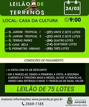 A prefeitura de Juranda vai realizar no próximo dia 24 (9h) leilão para a venda de 75 lotes.