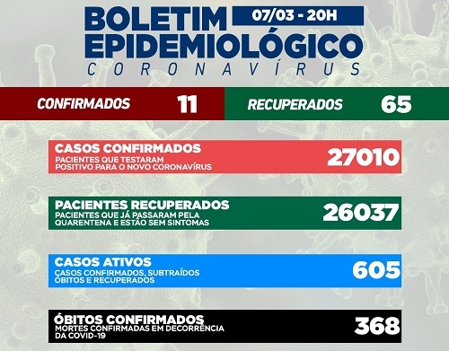 Apenas 11 casos de covid-19 foram confirmados nesta segunda-feira em Campo Mourão. Os recuperados foram 65. O número de casos ativos caiu para 605. Na ala covid há seis pessoas internadas, sendo duas na enfermaria (uma de Campo Mourão) e quatro na unidade de terapia intensiva. A taxa de ocupação de leitos do SUS está em 25% e 40% respectivamente.