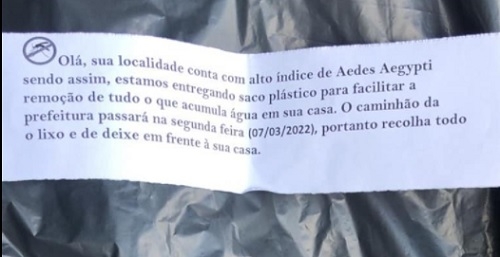 A prefeitura de Barbosa Ferraz distribuiu sacos plásticos em casas de vários pontos da cidade. Foi para que os moradores retirassem do quintal tudo que acumulasse água. Junto ao saco, um bilhete dizendo que a região da cidade está com alto índice de infestação do Aedes aegypti. Trabalho, claro, de combate à dengue.