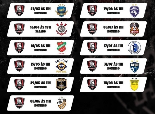 Campo Mourão divulgou o calendário de jogos que fará em casa (leia-se Ginasião) na temporada 2022 da Liga Nacional de Futsal. O primeiro será no próximo dia 27 contra Pato Branco. Será um domingo, às 11h. A segunda partida no Belin Carolo vai ser contra um tal de Corinthians, dia 16 de abril, às 19h. É um sábado. Na primeira fase serão 21 partidas, 11 em casa e 10 fora.