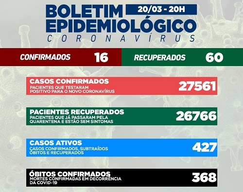 Depois de três dias com número alto de novos casos, Campo Mourão voltou neste domingo a ter redução de casos ativos de covid-19. Agora são 427. Isto porque o dia teve 16 confirmações e 60 recuperações. Na ala covid, seguem três internações - duas na enfermaia, ambas de pacientes de Luiziana, e uma na UTI, de morador de Terra Boa.