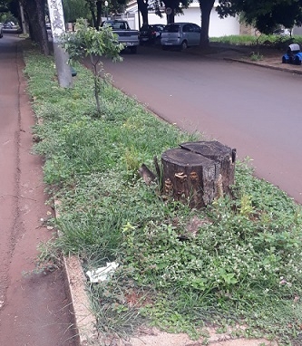 Rua Mato Grosso, esquina com av. Manoel Mendes de Camargo. A árvore foi cortadas e os tocos ficaram sobre a calçada, impedindo a passagem de pedestres.