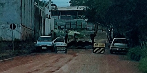 Jardim Modelo. Foi asfaltado uma parte e agora estão passando esgoto, destruindo asfalto novo e calçadas. E dá-lhe terra na rua.