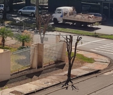Na área central de Campo Mourão cortaram essas duas árvores ainda jovens, semana passada. Elas faziam uma sombra maravilhosa. Morei em Cascavel e Guarapuava há uns 20 anos e nessa época já era proibido cortar os galhos das árvores dentro do próprio quintal, sem autorização, que dirá as árvores da rua. Com as temperaturas elevadas que estamos vivendo, considero um crime fazer isso.