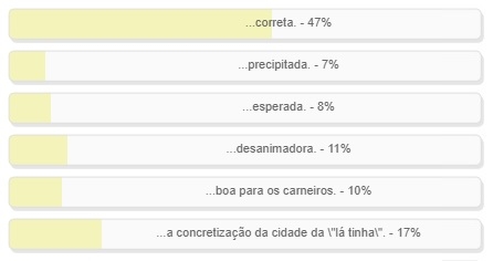 "A decisão de Campo Mourão não fazer este ano a Festa do Carneiro no Buraco foi..." Enquete teve votação encerrada neste domingo. Para 47% a decisão foi "correta". Já para 17% foi a "concretização da cidade de "lá tinha"". Teve 11% que achou "desanimadora" e 10% "boa para os carneiros". O resultado completo está no quadro acima.