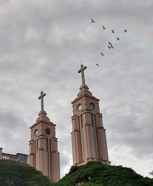 "Todas as manhãs essas aves, cujo o nome eu não sei. voam sentindo sul a norte, passando junto às torres da Catedral de Campo Mourão".